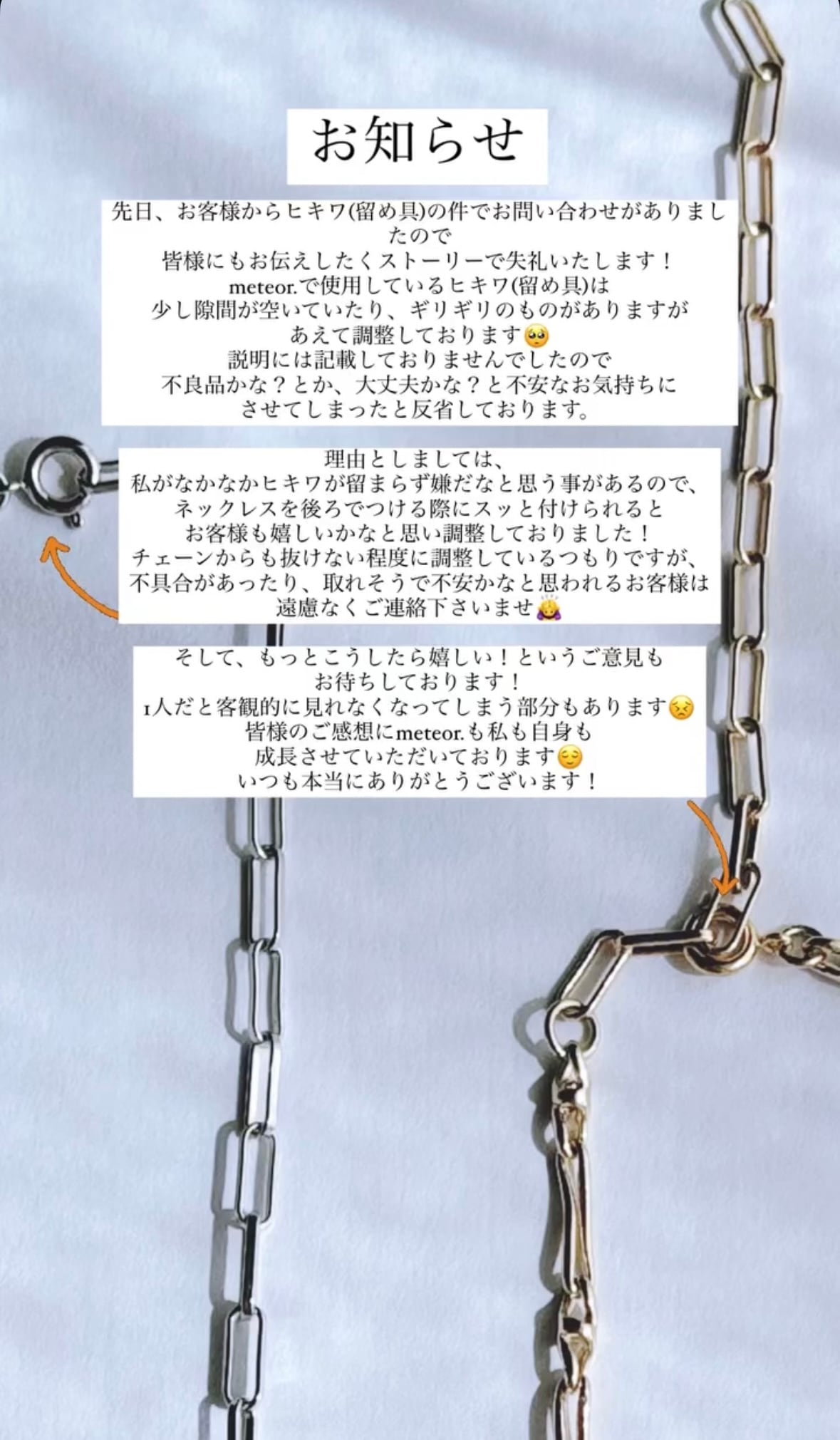 理由としましては、私がなかなかヒキワが留まらず嫌だなと思う事があるので、ネックレスを後ろでつける際にスッと付けられるとお客様も嬉しいかなと思い調整しております。